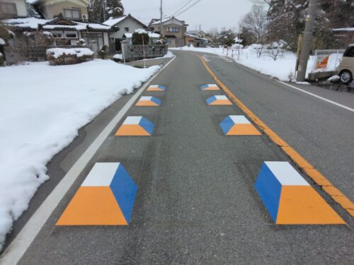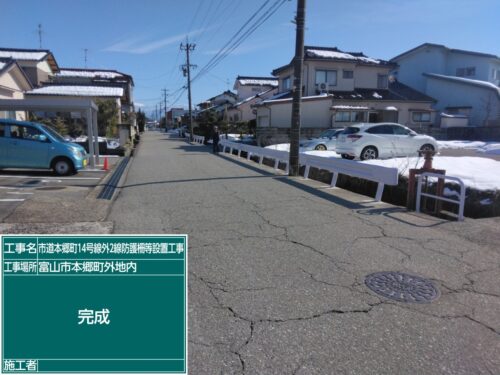 市道本郷町14号線外2線防護柵等設置工事 最新施工事例DCP PHOTO 2025.09.27 工事名 市道本郷町14号線外2線防護柵等設置工事 発注者 富山市 工期 令和6年12月16日~令和7年2月28日 現場代理人 りーくん 危険箇所にガードレールの新設と、路面標示を施工しました。 右側の路面標示はイメージ狭さくというもので、視覚的に道路を狭く見せることでスピード抑止を目的としたものになります。